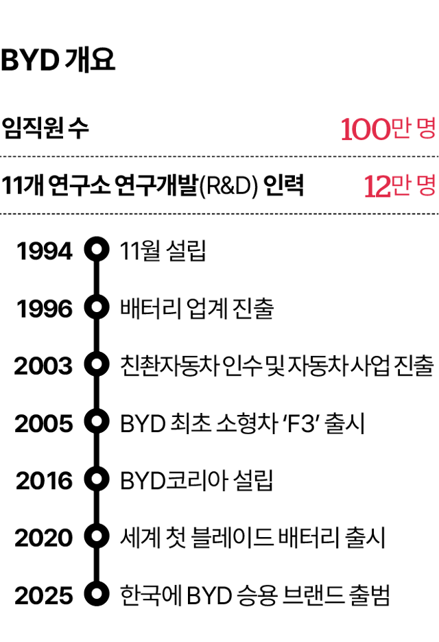 1994년 배터리 회사로 시작한 BYD는 2003년 자동차 시장에 뛰어들었다. 완성차 생산 역사는 짧지만 중국 정부의 전기차 지원 정책을 발판 삼아 광대한 내수 시장에서 몸집을 키웠고 가격 경쟁력을 앞세워 100여 개 나라에 진출했다. 2024년 글로벌 판매량은 427만 대로, 3년 연속 세계 전기차 판매 1위 기업에 이름을 올렸다.