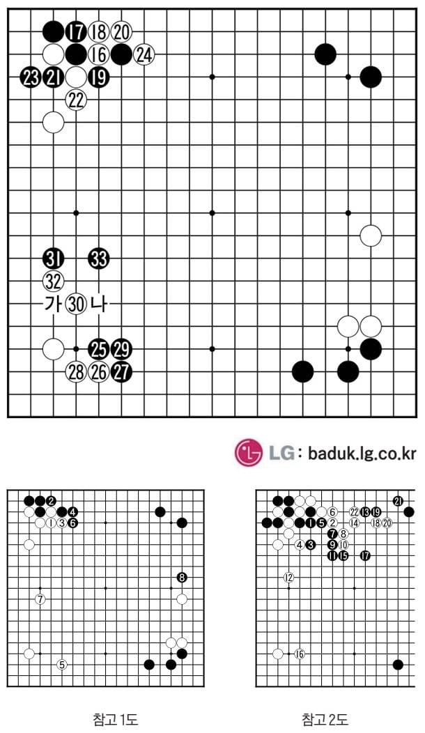 30으로는 ‘가’로 받는 것이 보통의 정석. 30으로 한 줄 높이자 흑도 즉각 형태의 급소인 31로 다가갔다. 32는 당연한 수비. 33은 ‘나’로 봉쇄하는 수와 좌상귀 움직임을 보는 호착이다.
