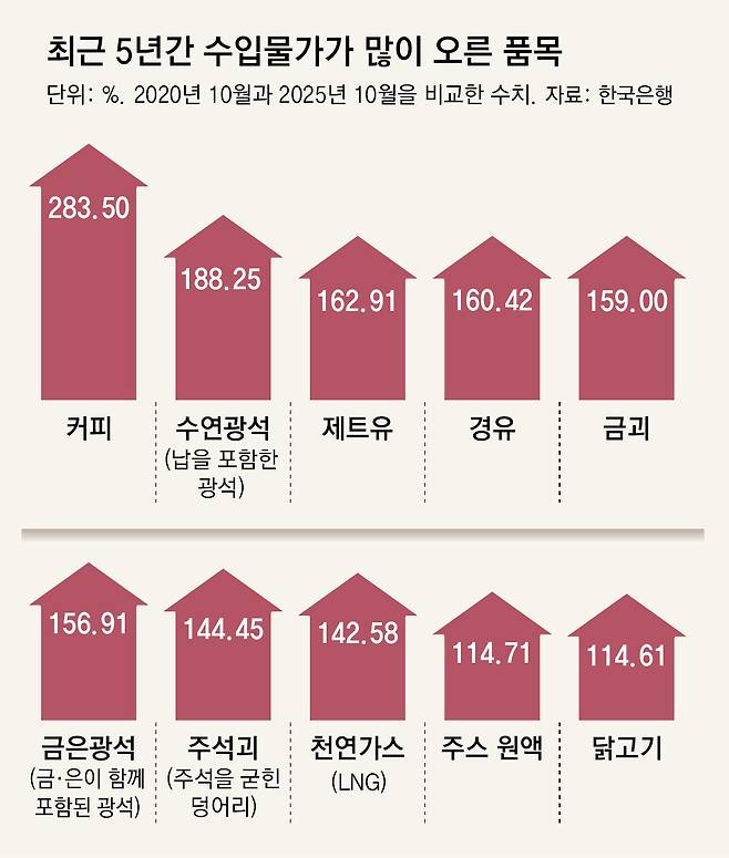 실제로 한국은행에 따르면 최근 5년간(2020년 10월과 2025년 10월 비교) 수입물가 중 기업들이 많이 수입하는 원재료와 중간재 수입물가가 유독 많이 뛰었다.