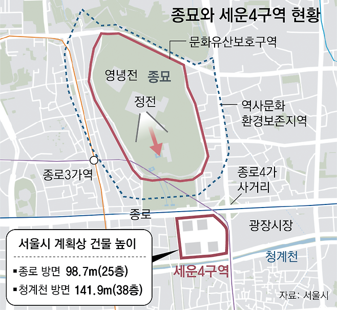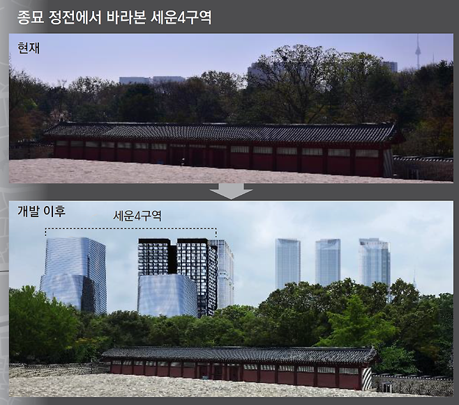 시뮬레이션에 따르면 서울시 계획대로 4구역을 개발할 경우 종묘 정전에서 바라보면 종묘와 가까운 종로변 오피스 2개 동(20층·98.7m)은 상부 절반가량이, 청계천변 오피스·오피스텔 3개 동(최고 38층·141.9m)은 절반 이상이 모두 보인다. 4구역 방면 을지트윈타워(20층)나 힐스테이트세운센트럴(27층)이 수목선(나무 높이)과 거의 비슷해 잘 보이지 않는 것과는 차이가 있다.