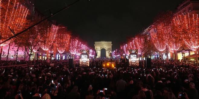 16일 프랑스 파리 샹젤리제 거리에서 성탄절 조명 점등식이 열려 일대의 가로수가 붉게 빛나고 있다. 이 행사는 매년 11월 하순부터 연말까지 개선문을 중심으로 양쪽 2km 구간에 설치된 나무 400여 그루의 조명을 한꺼번에 켜는 식으로 이뤄진다.