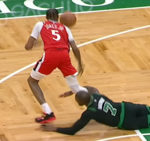 보스턴의 공격 상황에서 제일런 브라운이 턴오버를 저질렀고, 이 공을 스틸한 데릭 존스 주니어가 속공으로 연결하려고 하자, 코트에 쓰러지고 있던 브라운이 달리려는 존스 주니어의 무릎을 강하게 때리며 저지한 것이다.