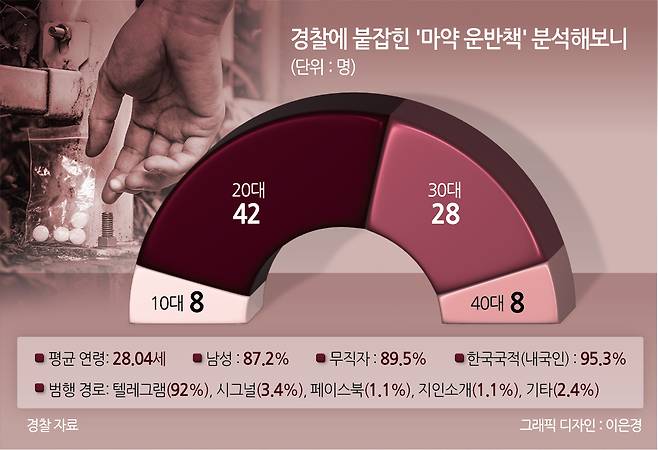 마약 수사를 전담하는 경찰 수사관은 “주로 사회 경험이 없거나 마약의 위험성을 모르는 20대들이 많다. 보이스피싱 범죄에서 피해금을 수거하는 수거책과 비슷한 구조”라며 “세상 물정을 모르는 젊은 사람들이 많다”고 말했다.