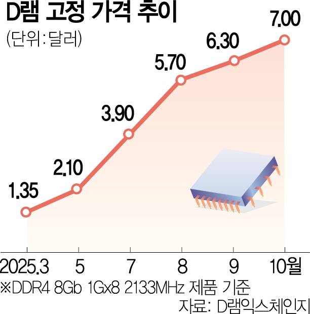 중앙처리장치(CPU)나 그래픽처리장치(GPU)가 빠르게 정보를 처리할 수 있게 데이터를 임시 저장하는 D램의 시장 가격은 최근 가파르게 오르고 있다. 범용 D램인 더블데이터레이트(DDR) 8Gb(기가비트)의 가격은 올 1분기까지 1.35달러에 그쳤지만 5월 2달러를 돌파한 뒤 8월 5달러, 10월 말에는 7달러를 넘어선 상황이다.