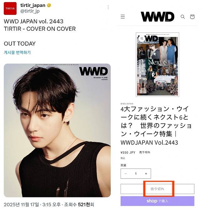 17일에는 티르티르 재팬이 패션·뷰티 전문 글로벌 미디어 WWD재팬의 표지 모델로 뷔가 선정됐다는 소식을 공식 발표했다. 발표 직후, WWD재팬 판매처 상당수에 품절 공지가 뜨며 이른바 ‘뷔이펙트’가 재차 확인됐다.