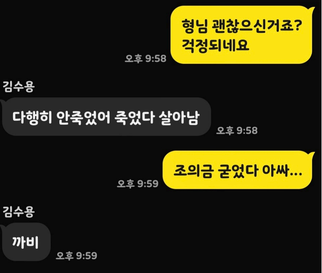 17일 윤석주는 자신의 SNS에 김수용과 나눈 카톡 메시지를 공개했다. 그는 “형님 괜찮으신 거죠? 너무 걱정된다”고 조심스레 안부를 물었다. 이에 김수용은 “다행히 안 죽었어. 죽었다 살아남”이라며 특유의 건조한 유머로 상태를 전했다.