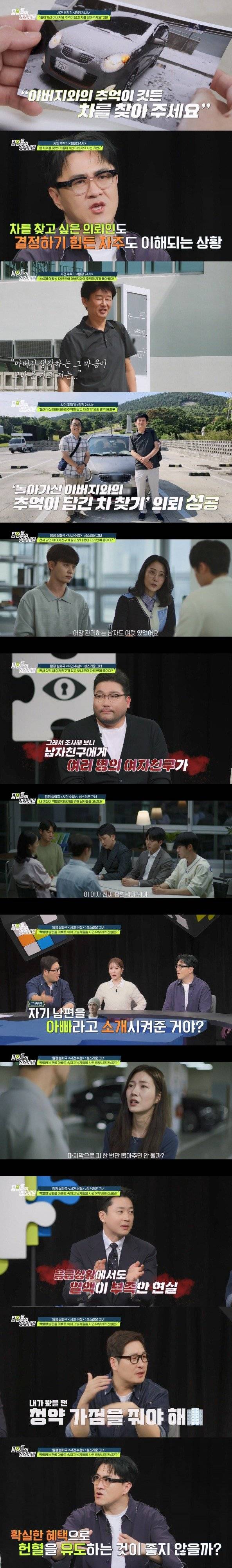 지난 17일 방송된 채널A ‘탐정들의 영업비밀’ 속 ‘탐정 24시’에서는 ‘부부 탐정단’이 첫 의뢰를 성공적으로 마쳤다. 부부 탐정단을 찾은 의뢰인은 2013년에 중고로 팔았던 아버지와의 추억이 담긴 차를 되찾고 싶다고 부탁했다. 의뢰인이 차량을 판매했던 중고차 매매 상사는 이미 폐업한 지 오래였지만, ‘카히스토리’ 검색을 통해 해당 차량은 운행 중이며 울산에 있는 것이 확인됐다. 탐정단은 단서가 없지만 아직 폐차되지 않았다는 사실만으로도 감사하며 울산으로 향했다. 정비소부터 자동차 검사소까지 탐문하던 탐정단은 현재 차주의 연락처가 있는 검사소를 찾아냈다. 직원의 협조로 탐정단은 현재 차주와 통화에 이어 만남까지 성사시켰다.