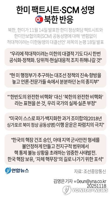 다만 북한은 이번 팩트시트 및 SCM 공동성명에 대한 반응을 당국자 명의의 공식 성명이나 담화가 아닌 조선중앙통신 논평 형식으로 냈고, 트럼프 대통령이나 이재명 대통령을 실명 비난하지 않았다.