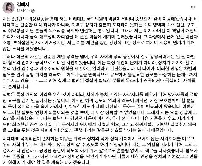 17일 김 의원은 자신의 페이스북에 "지난 5년간의 의정활동을 통해 저는 비례대표 국회의원의 역할이 얼마나 중요한지 깊이 체감해왔다. 비례대표는 단순한 의석 하나가 아니라, 지역구 정치가 충분히 포착하지 못하는 소외 영역과 소수 집단, 구조적 취약성을 지닌 분들의 목소리를 국회와 연결하는 통로"라며 "그래서 저는 제게 주어진 이 책임이 개인의 자리가 아니라 공적 대표성의 자리임을 매 순간 마음에 새기며 일해왔다"라고 밝혔다.