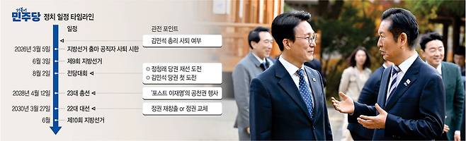 차기 민주당 전당대회는 내년 8월에 열린다. 그해 6월 지방선거가 끝난 지 2개월 만이다. 지방선거 승리에 결정적으로 기여해야 김민석은 당권 첫 도전을, 정청래는 재선 도전을 도모할 수 있다. 승리의 관건은 서울시장선거다. 전국 광역단체장 중 가장 상징적인 자리로, 지방선거 전체 승패의 기준점이 되는 선거이기 때문이다.