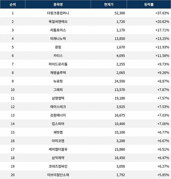 6위 카티스(140430)는 현재가 4,095원으로 11.58% 상승 중이다. 7위 하이드로리튬(101670)은 현재가 2,255원으로 9.73% 상승 중이다. 8위 재영솔루텍(049630)은 현재가 2,065원으로 9.26% 상승 중이다. 9위 뉴로핏(380550)은 현재가 24,550원으로 8.87% 상승 중이다. 10위 그래피(318060)는 현재가 13,570원으로 7.87% 상승 중이다.