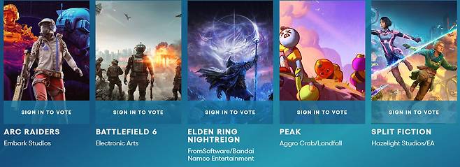 멀티플레이어 부문에는 '아크 레이더스' 외에 '배틀필드6' '엘든 링 밤의 통치자' '피크(PEAK)' '스플릿 픽션'이 후보에 올랐다.