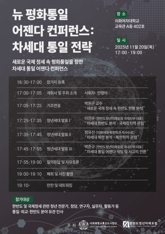 이화여자대학교 통일교육선도대학 사업단과 한반도청년미래포럼은 오는 20일 이화여자대학교에서 ‘뉴 평화통일 어젠다 컨퍼런스: 차세대 통일 전략’을 개최한다고 18일 밝혔다. 이번 컨퍼런스는 변화하는 국제 환경 속에서 청년들이 주도하는 실질적 통일 전략을 모색하고, 한반도 문제 해결을 위한 차세대 의제를 구성하기 위해 마련됐다.