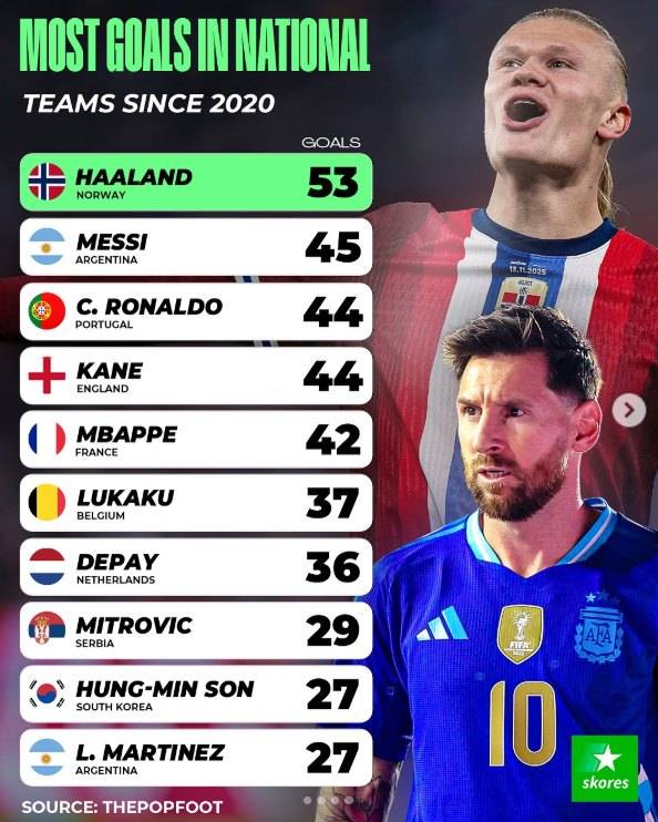 글로벌 축구매체 '스코어스'는 지난 16일(한국시간) 사회관계망서비스(SNS)를 통해 '2020년 이후 국가대표팀 최다골 TOP 10'을 공개했다.