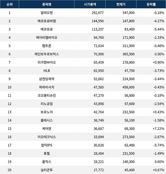 시가총액 3위 에코프로(086520)는 83,400원으로 ▼5.44% 하락하고 있으며, 에이비엘바이오(298380)는 ▼2.33% 하락한 171,900원을 기록하고 있다. 펩트론(087010)은 311,500원으로 ▼0.48%, 레인보우로보틱스(277810)는 ▼3.56% 하락한 365,500원이다. 리가켐바이오(141080)는 178,800원으로 ▲0.90% 상승하고 있으며, HLB(028300)는 ▼3.73% 하락한 47,750원이다. 삼천당제약(000250)은 ▼3.44% 하락한 224,500원, 파마리서치(214450)는 ▼0.43% 하락한 458,000원을 기록하고 있다.