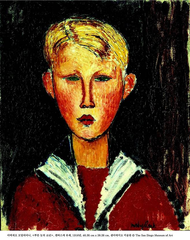 이 작품은 모딜리아니가 프랑스 파리에 머무르며 자기만의 화풍을 완성했던 시기인 1916년에 그렸다. 당시 모딜리아니는 주변 아이들을 종종 모델로 삼곤 했다. 푸른 눈의 소년 역시 그중 하나로 추정된다.