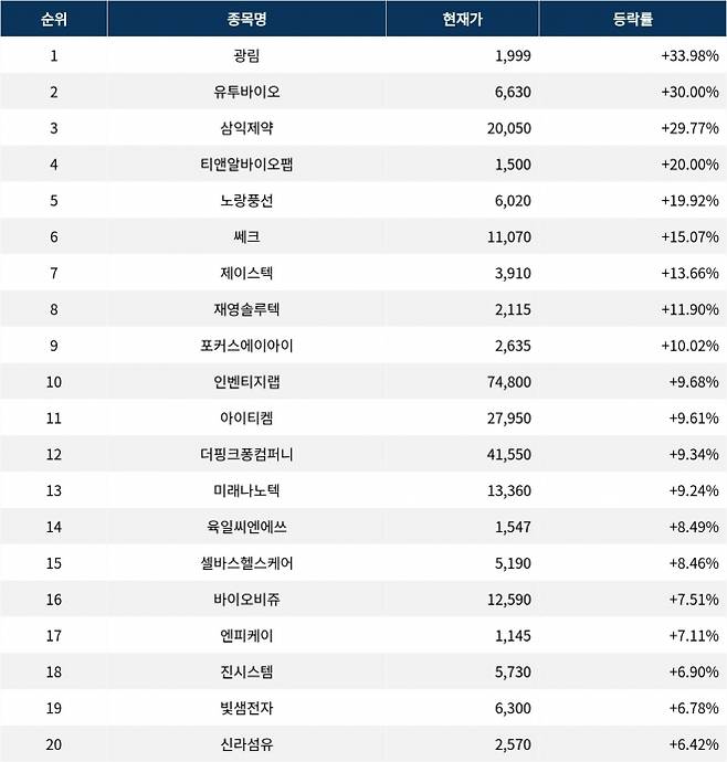 이어 상승률 2위 유투바이오(221800)는 주가가 30.00% 상한가에 도달하며 종가 6,630원에 상승 마감했다. 상승률 3위 삼익제약(014950)의 주가는 20,050원으로 29.77% 폭등하며 거래를 마쳤다. 상승률 4위 티앤알바이오팹(246710)은 20.00% 급등하며 1,500원에 마감했다. 상승률 5위 노랑풍선(104620)은 19.92%의 급등세를 타고 종가 6,020원에 마감했다.