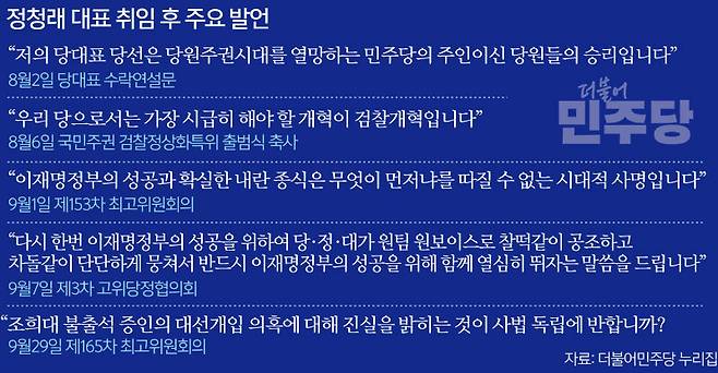 문제는 앞으로다. 내년 지방선거 승리를 목표로 정 대표는 중도층을 포섭할 민생·경제·청년 등 정책 관련 발언을 늘릴 수밖에 없다. 그러나 여전히 당원주권과 개혁을 강조하는 정 대표가 얼마나 세를 불릴 수 있을지는 자신에게 달렸다고 전문가들은 밝혔다.