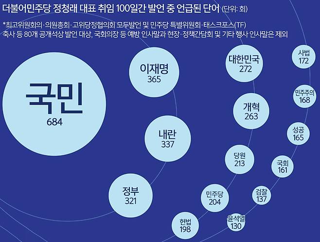 한편 박창환 장안대 특임교수(정치학)는 “국민-이재명-내란은 정 대표에게 삼위일체처럼 한 몸”이라고 분석했다. 박 교수는 “이번 대선이 계엄과 탄핵으로 시작된 선거라 국민의 뜻이라고 명분을 표현할 수밖에 없었고, 정 대표는 이 뜻을 ‘이재명정부 성공과 내란세력 척결’로 해석한 것”이라며 “이재명정부 출발은 국민 명령으로 나라 명운을 살리는 것이며 이를 막으면 내란 세력이라 세 키워드는 일관되게 연결된다”고 말했다.