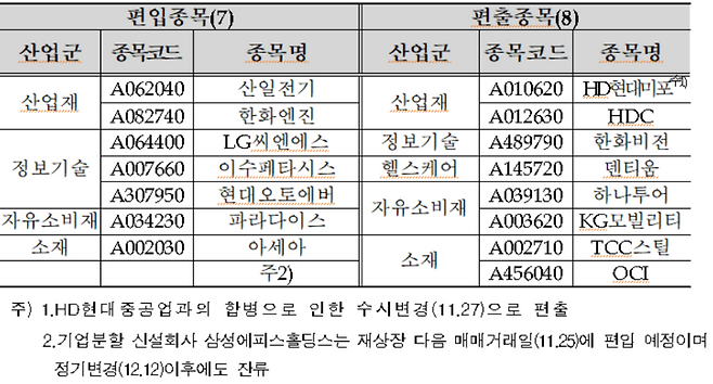 기업분할 신설회사인 삼성에피스홀딩스는 재상장 다음 매매거래일인 오는 25일에 지수편입 예정이며, 12월 12일 이후에도 지수에 잔류한다.