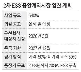국내 최대 규모인 1조원대 에너지저장장치(ESS) 2차 사업 입찰을 앞두고 LG에너지솔루션·삼성SDI·SK온 등 배터리 3사가 물밑 경쟁을 본격화한다. 1차 때와 달리 비가격 평가 비중이 높아지면서 판도 변화가 예상된다.