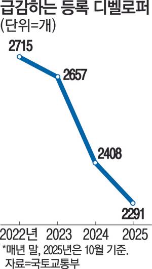 18일 매일경제가 국토교통부의 ‘부동산개발업 등록 현황’ 통계를 분석한 결과 2023년부터 올해까지 3년 연속으로 폐업 업체가 신규 등록을 앞서고 있는 것으로 집계됐다. 관련 통계가 공개된 2017년 이후 처음이다.
