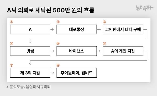 그런데 뉴스타파가 추적한 캄보디아 스캠 조직은 이 모든 AML 조치를 뚫고 자금세탁에 성공했다. 거래가 제한된 후이원페이로 직접 송금할 수는 없었지만, ‘안전’ 거래소인 바이낸스를 경유하니 우회적으로 테더를 보낼 수 있던 것이다. 테더가 국내로 재유입되는 과정에서도 송금 액수를 쪼개 AML 조치를 피한 것은 마찬가지였다.