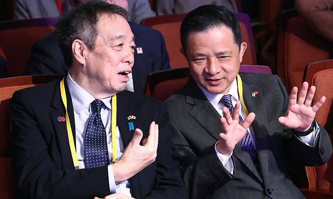 | 대화 나누는 주한 중·일대사 18일 서울 서초구 국립외교원에서 열린 ‘서울외교포럼 2025’에 참석한 미즈시마 고이치 주한 일본대사(왼쪽)와 다이빙 주한 중국대사가 이야기를 나누고 있다. 뉴스1 |