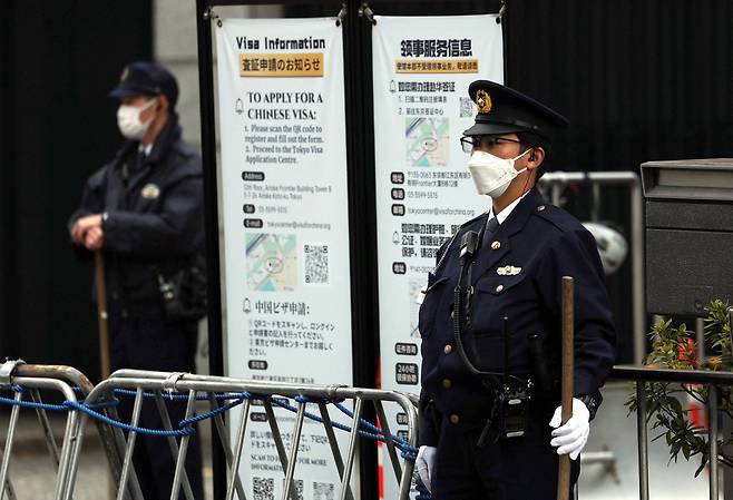 | 긴장감 감도는 주일 中대사관 다카이치 사나에 일본 총리가 대만 유사시 개입 가능성을 언급한 것을 두고 중국, 일본의 갈등이 심각해지는 가운데 18일 일본 경찰관들이 수도 도쿄에 위치한 주일 중국대사관 입구에서 경계근무를 서고 있다. 도쿄=로이터연합뉴스 |