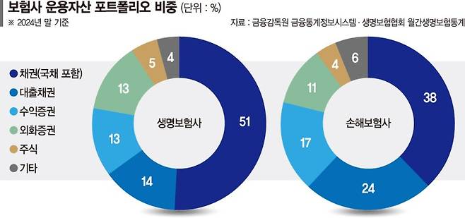 18일 보험업계에 따르면 지난해 말 기준 생명보험사는 전체 운용자산 780조원 가운데 약 51%를 국채를 포함안 채권에 투입했다. 1년 전과 비교해 채권 비중은 2%p 상승했다. 이어 부동산담보대출금·신용대출금·유가증권담보대출금 등 대출채권 14%, 수익증권 13%, 외화증권 13%, 주식 5% 순이다. 같은 기간 손해보험사도 운용자산 343조원 중 채권(38%)의 비중이 제일 높았다.