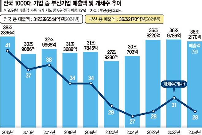 2024년 매출액 기준 전국 1000대 기업 중 부산기업은 28개사로 2023년 31개사에서 3개사가 줄어들었다.