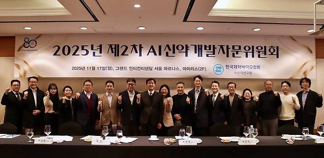 [17일 열린 한국제약바이오협회의 제2차 AI신약개발 자문위원회에 참석한 관계자들이 기념촬영을 하고 있다. (자료: 한국제약바이오협회)]