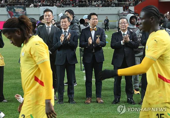 정몽규 대한축구협회장과 최고조 주한가나대사가 입장하는 선수들을 향해 박수치고 있다. 2025.11.18