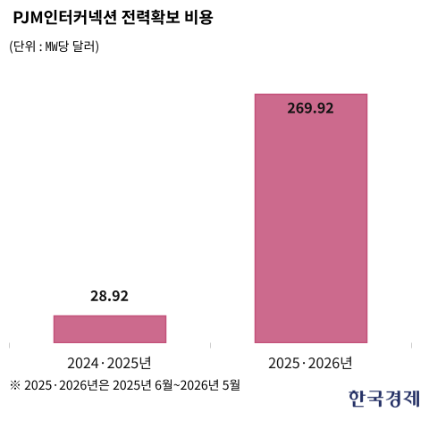 버지니아, 일리노이, 오하이오 등 13개 주 전력망을 운영하는 미국 최대 전력 공급사 PJM인터커넥션은 현재 전력 수요와 공급 사이에 심각한 불균형이 발생하고 있다고 밝혔습니다. PJM의 2025·2026년(2025년 6월~2026년 5월) 전력 확보 비용은 메가와트(㎿)당 269.92달러로, 지난해 가격(㎿당 28.92달러)의 열 배 수준으로 급등했습니다. 총 전력 확보 비용 가운데 데이터센터 수요가 전체의 63%를 차지한 것으로 집계됐습니다.