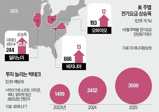 미국에서 데이터센터가 가장 많은 버지니아주(666개)에서는 이 기간 전기요금이 13% 인상됐습니다. 데이터센터 244곳이 밀집한 일리노이주는 15.8%, 193곳이 있는 오하이오주는 12% 뛰었습니다. 이는 미국의 평균 전기요금 인상률(5.1%) 대비 2~3배입니다.