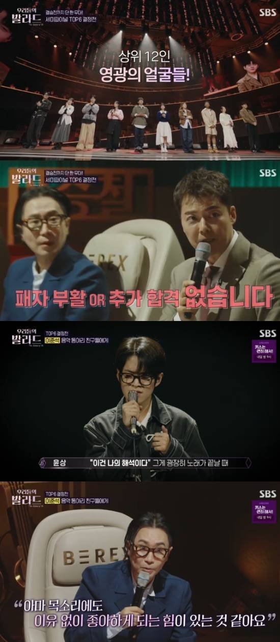 18일 방송된 SBS 예능 프로그램 '우리들의 발라드'에서는 파이널 무대를 향한 'TOP 12'(김윤이, 최은빈, 천범석, 정지웅, 이예지, 홍승민, 임지성, 송지우, 이지훈, 이준석, 민수현, 제레미)의 치열한 경쟁이 펼쳐졌다.