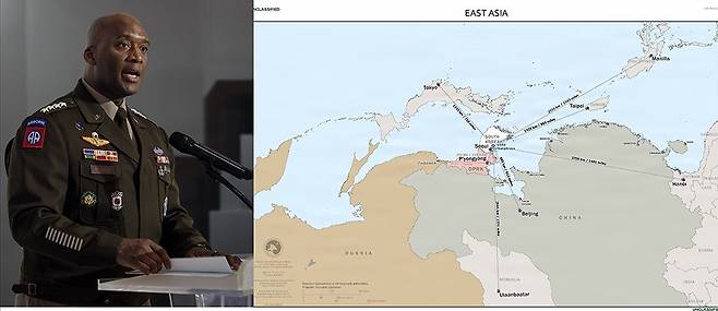 제이비어 브런슨 주한미군사령관이 17일 위아래를 뒤집어 그린 동아시아 지도를 공개하면서 한국이 북한뿐 아니라 중국, 러시아의 위협을 억제할 전략적 중심축이라고 밝혔다.