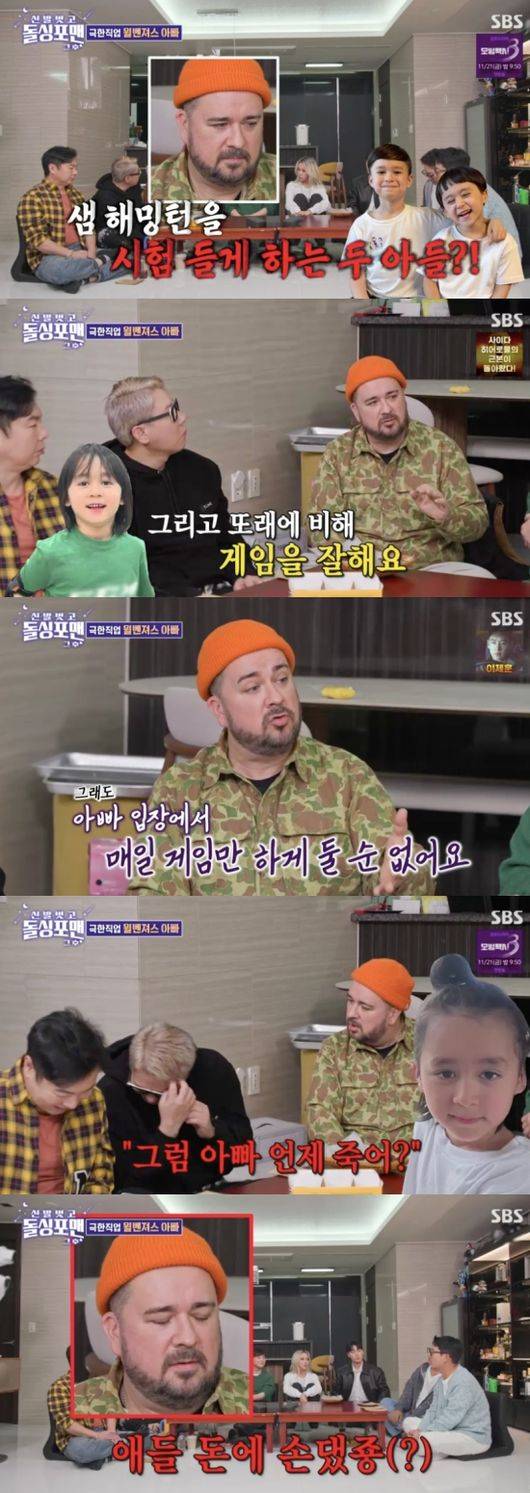 샘 해밍턴은 두 아들 때문에 시험에 든다고 밝혔다. 이상민은 최근에 가장 화났던 순간을 물었고 샘 해밍턴은 “벤틀리 장래희망은 프로게이머다. 시간만 나면 한다. 그 나이에 정말 잘한다. 나쁘진 않은데 아빠 입장에서 매일 게임만 하게 할 수 없다. 공부도 해야 하고 할 게 많다”라고 말했다.