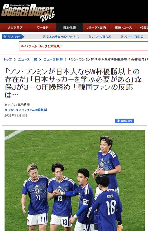 대한민국 캡틴 손흥민(LA FC)에 대한 언급도 있었다. "손흥민이 일본이이었다면 월드컵 우승 그 이상의 성적을 거뒀을 것"이라는 내용의 댓글이 달렸다고 이 매체는 전했다.