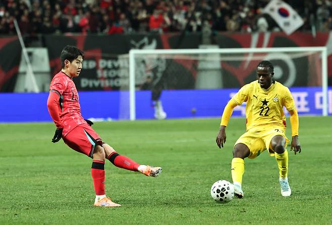 | ▲ 18일 서울 마포구 서울월드컵경기장에서 열린 남자축구 국가대표 A매치 평가전 대한민국과 가나의 경기. 이강인이 패스를 하고 있다. |