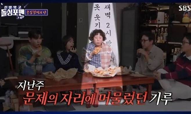 김준호는 "녹화 중간에 '빠직'하길래 의자가 휘어진 줄 알았다고 하더라"며 신기루와 나눈 통화 내용을 전했다. 이에 이상민은 "나도 기루랑 통화했는데 네가 대표라서 준호한테 말하라더라"며 "네가 사장이니까 자기는 산재라고 했다"고 받아쳐 웃음을 자아냈다.