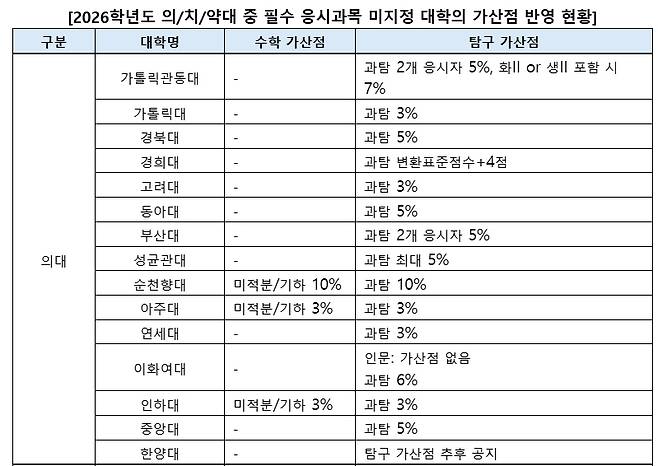 우연철 진학사 입시전략연구소장은 "사탐 허용으로 의·치·약대 교차지원 폭은 넓어졌지만 당락을 결정하는 핵심 요소는 여전히 수학과 탐구 반영 방식"이라며 "대다수 대학이 미적분·기하 또는 과탐에 가산점을 주는 만큼, 인문계 과목 응시자는 대학별 수능 반영 방법을 반드시 세밀하게 확인해야 한다"고 조언했다.