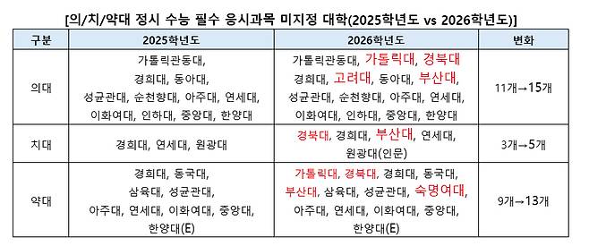 가톨릭대와 경북대, 부산대는 올해 수학과 탐구 지정과목을 모두 폐지했고, 고려대는 탐구에만 지정했던 선택과목을 없애면서 필수 응시과목이 없어졌다.