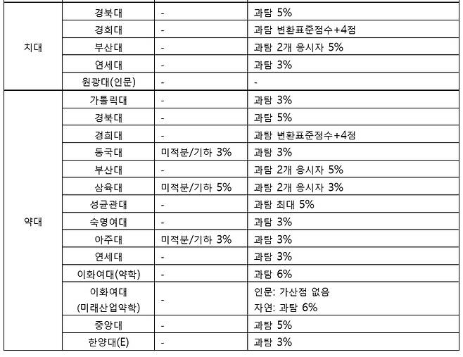 치대와 약대에서도 사탐 허용 대학이 증가했다. 치대의 경우 올해 경북대와 부산대가 지정과목을 폐지하면서 11개 치대 중 5개교에 확률과통계, 사탐 응시자도 지원할 수 있다.