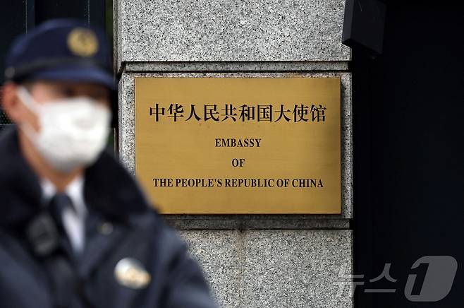 (도쿄 로이터=뉴스1) 양은하 기자 = 18일 일본 경찰관이 도쿄의 중국대사관 정문 표지판 옆에서 경계를 서고 있다. 2025. 11. 18.