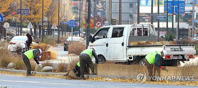 (인천=연합뉴스) 임순석 기자 = 19일 인천 남동구 구월동 한 도로 화단에 남동구청 녹지과 직원들이 겨울철 동해 피해를 예방하기 위해 볏짚으로 된 바람막이를 설치하고 있다. 2025.11.19