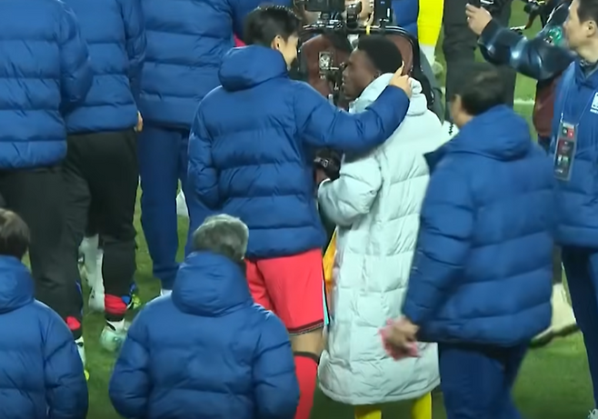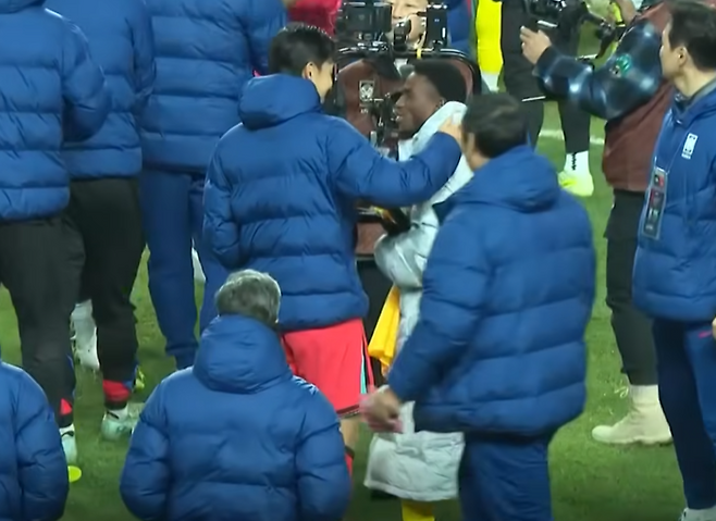 경기 후 그라운드로 걸어나가는 한국 선수단에게 흰 패딩점퍼를 입은 가나 선수단이 다가왔다.