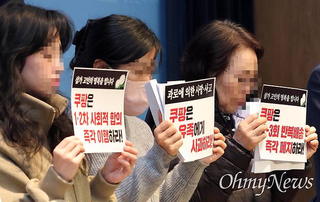 | ▲ 숨진 쿠팡기사 오승용씨 유족 기자회견 제주에서 새벽배송을 하다 숨진 쿠팡 택배기사 고 오승용씨 유족들이 19일 서울 여의도 국회 소통관에서 제 정당과 공동기자회견을 열고 쿠팡의 사과와 재발방지 대책을 요구하고 있다. |