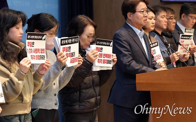 이날 회견을 주최한 원내 5당(민주당·조국혁신당·기본소득당·진보당·사회민주당)은 "유족에 대한 쿠팡의 사과를 받아내고 유족과 함께 계속되는 비극을 막기 위한 노력을 끝까지 해 나갈 것"이라며 "쿠팡은 자신들의 핵심 경쟁력인 새벽 배송 시스템이 지속 불가능한 상황이라는 것을 인정하고 진정성을 갖고 사회적 대화에 임하라"고 강조했다.