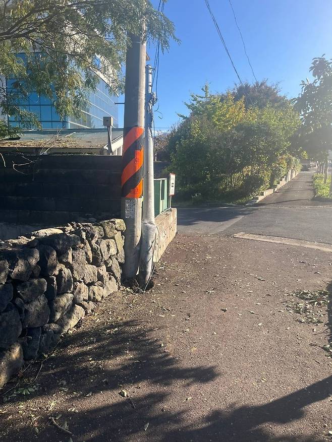 | ▲ 제주시 오라동 길가의 도로 전신주가 크게 휘어진 모습. 지난 10일 새벽배송 중이던 쿠팡 택배기사가 이곳에서 사고로 숨졌다. |